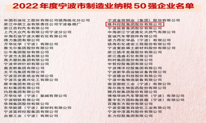 維科集團(tuán)榮獲2022年度寧波市制造業(yè)納稅50強(qiáng)