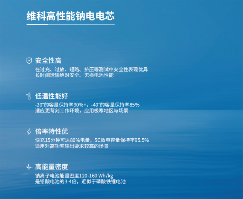 維科技術(shù)為本項(xiàng)目交付的鈉離子電池,容量為230Ah,具備安全性高、倍率性能高和循環(huán)壽命長等突出優(yōu)勢,即使在零下40℃時(shí)仍能保持近85%的容量,在多個(gè)儲(chǔ)能和動(dòng)力應(yīng)用場景中取得了良好的市場反響。目前,維科鈉電已完成了能量密度160Wh/kg、循環(huán)次數(shù)超6000次的新一代鈉離子電池技術(shù),性能指標(biāo)繼續(xù)領(lǐng)先業(yè)界,并將很快投入量產(chǎn)。
