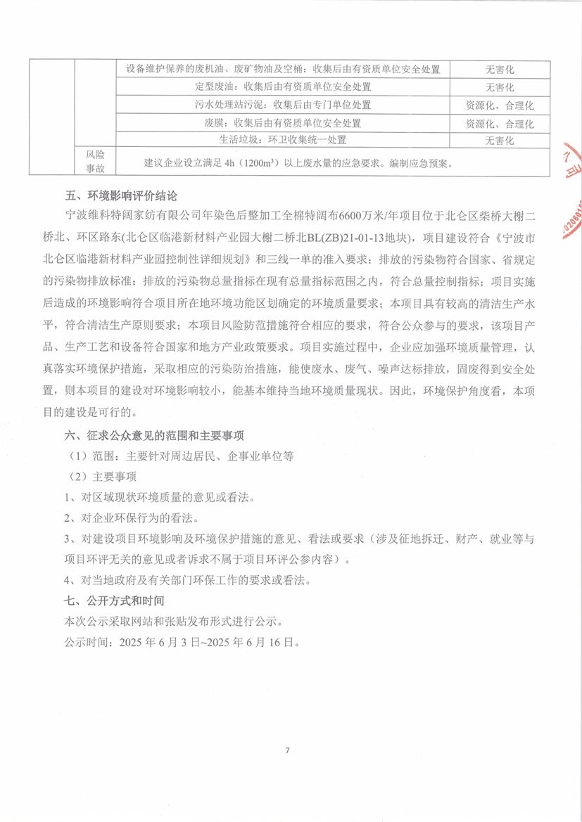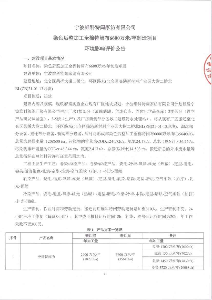 我公司的《寧波維科特闊家紡有限公司染色后整加工全棉特闊布6600萬米/年制造項目環(huán)境影響報告書》已完成編制,根據(jù)《浙江省建設(shè)項目環(huán)境保護管理辦法》(2021年修正)(省政府令第388號),現(xiàn)對項目主要內(nèi)容進行公示。