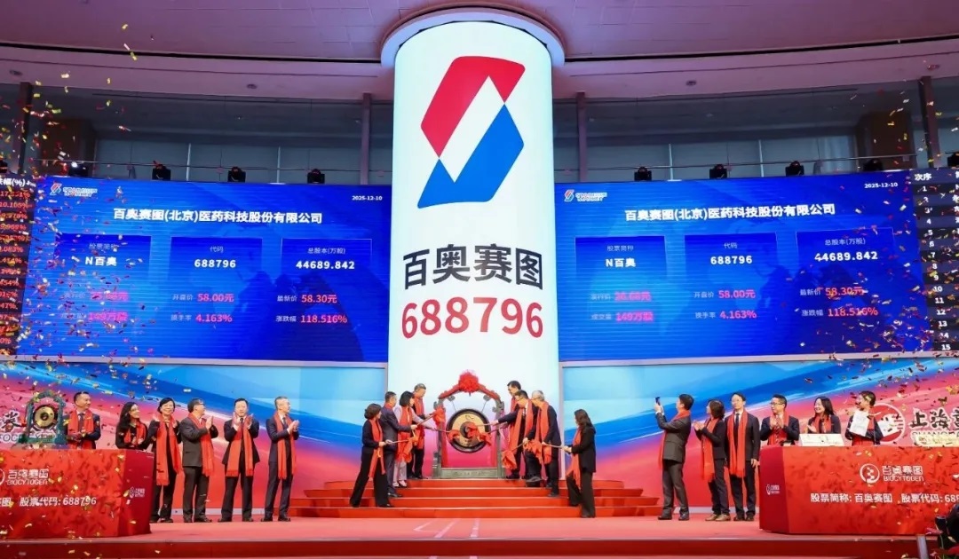 2025年12月10日,百奧賽圖(北京)醫(yī)藥科技股份有限公司在上海證券交易所科創(chuàng)板正式掛牌上市,股票簡(jiǎn)稱(chēng)“百奧賽圖”,證券代碼688796。相比4年前在港交所的亮相,這一次,百奧賽圖交出了一份更成熟的答卷。百奧賽圖的首日漲幅一度沖高到161.62%。